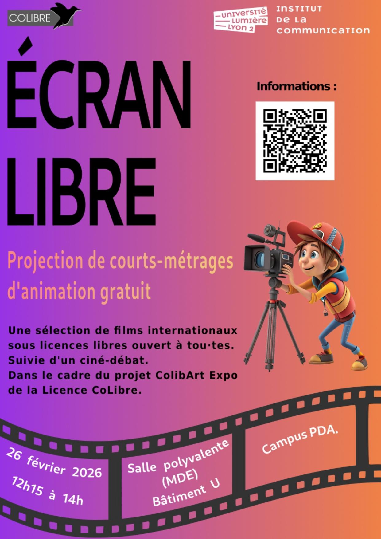 Le jeudi 26 février 2026, l’Université Lumière Lyon 2 accueillera Ecran libre, un événement visant à promouvoir la culture audiovisuelle libre et à sensibiliser le public à l’usage des licences ouvertes.
