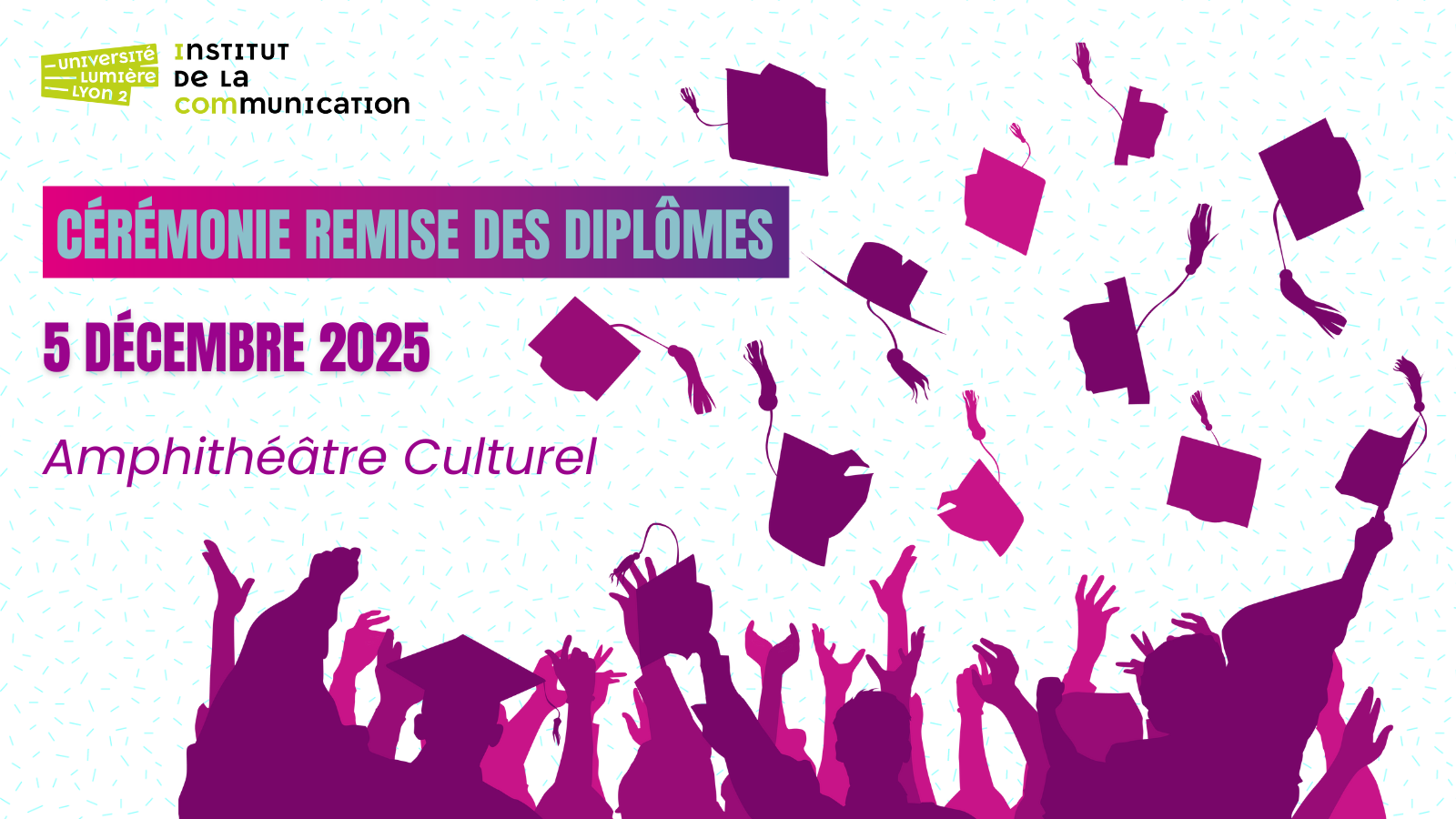L’Institut de Communication de l’Université Lumière – Lyon 2 a l’honneur de convier ses étudiants, étudiantes et leurs proches à la cérémonie de remise des diplômes de la promotion 2024-2025.