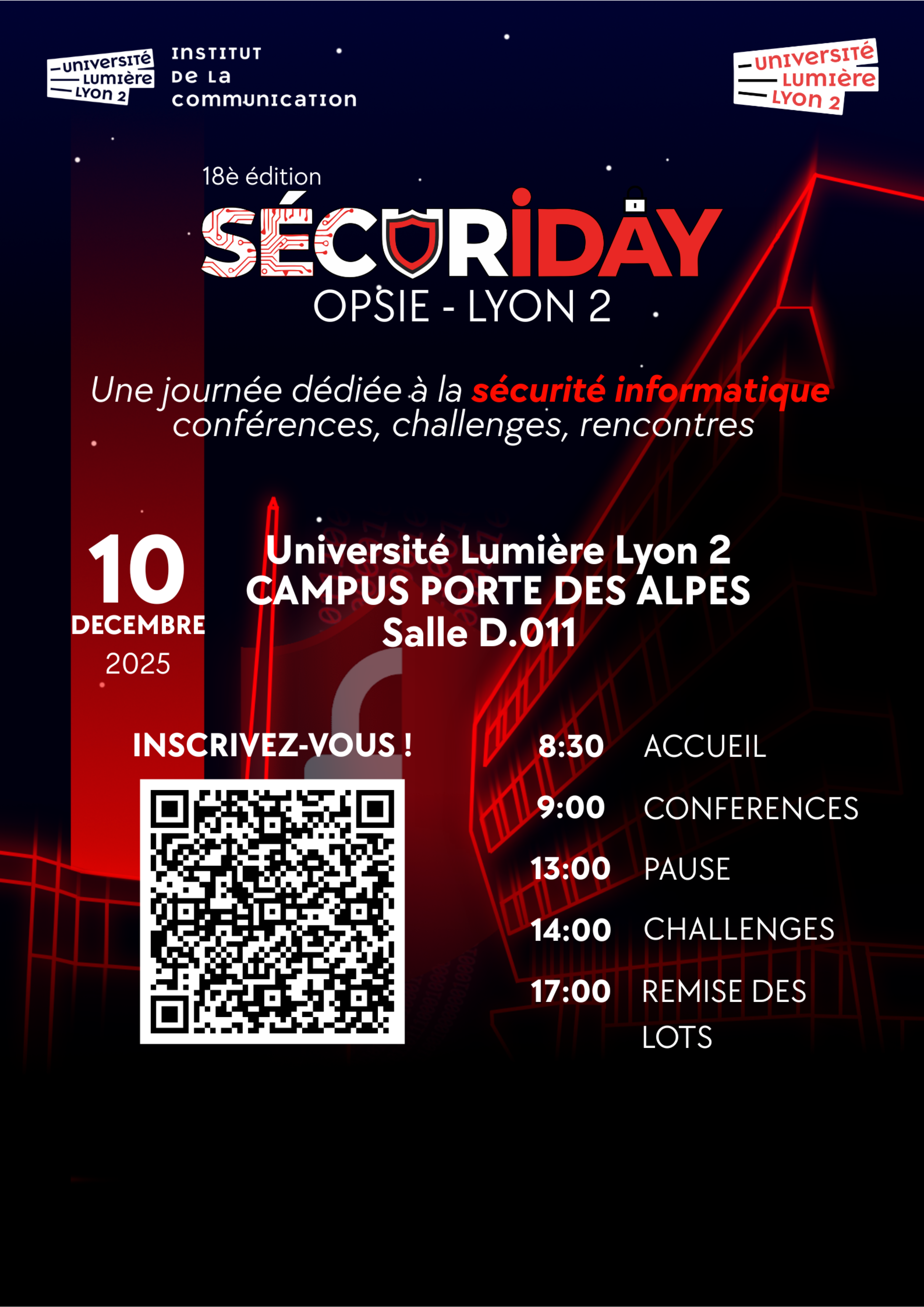 Organisé par les étudiants et étudiantes du Master 2 OPSIE de l’ICOM, l’événement invite tous ceux et celles qui s’intéressent à la sécurité informatique — étudiants, étudiantes, passionnés, passionnées ou professionnels et professionnelles — à découvrir les tendances du secteur, échanger avec des experts et relever des défis pratiques.