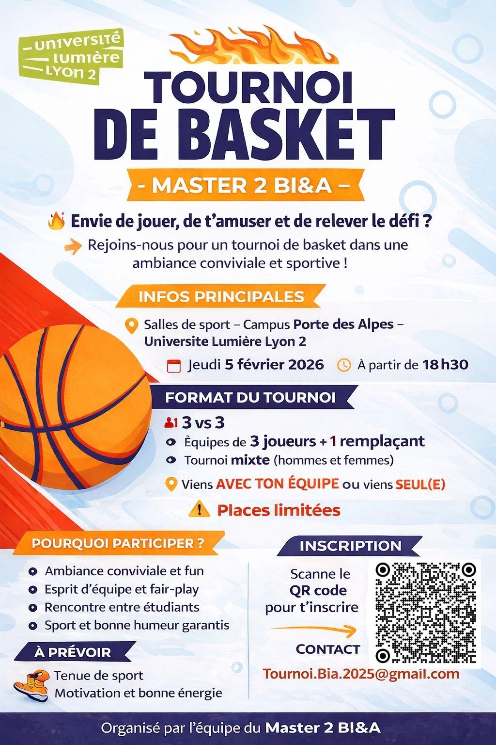 Les étudiantes et étudiants du Master 2 Business Intelligence et Analytics de l’ICOM organisent un tournoi de basket universitaire ouvert à l’ensemble de la communauté universitaire.